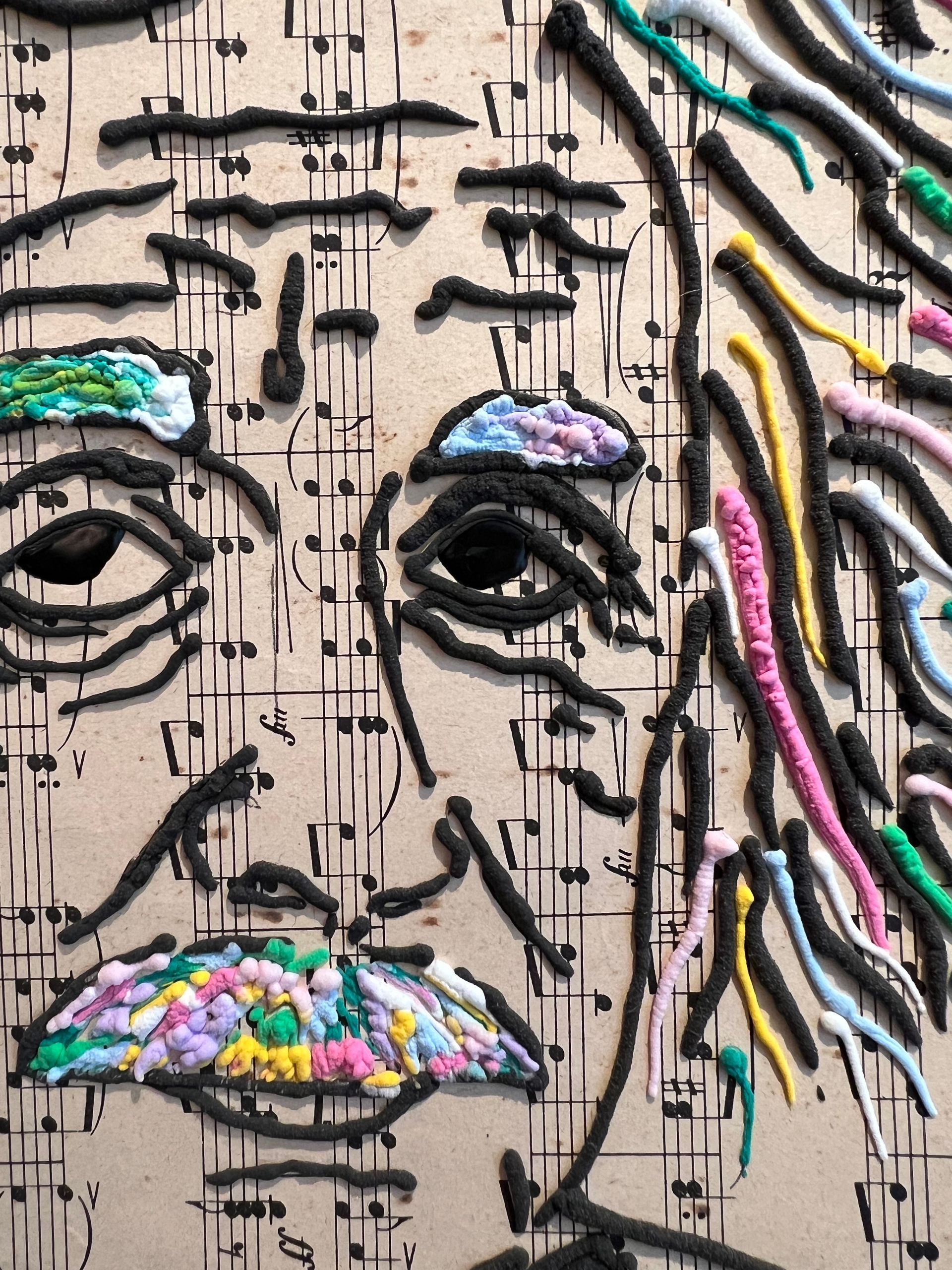 Relief Art entsteht durch das manuelle Auftragen weicher und glänzender Materialien direkt auf Papier oder Objekte. So entsteht eine dreidimensionale Linienführung, die mit Licht arbeitet, sich je nach Blickwinkel verändert und Tiefe erzeugt, ohne auf klassische Schattierung oder Illusion zurückzugreifen.